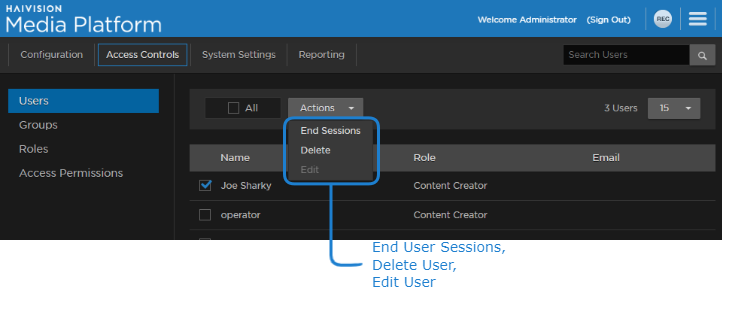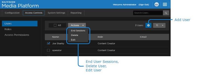Haivision Media Platform allows you to display a list of users, add/delete them, change their passwords, assign roles to them, and end any of their current sessions. The available functionality of the Users list depends on the account usecase defined in the User Provisioning/SSO screen, as described in Managing User Provisioning/SSO.