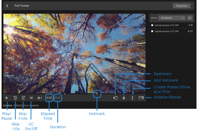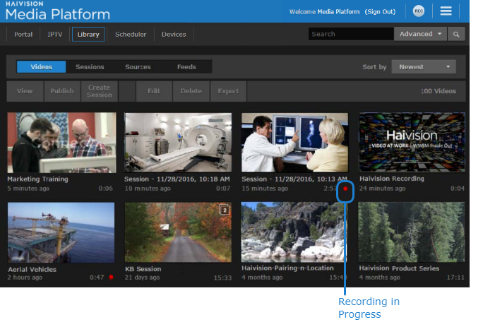Locate the video to play, hover the mouse over the item, and click the icon. For viewing and search options to locate videos, see Exploring the Web Interface.