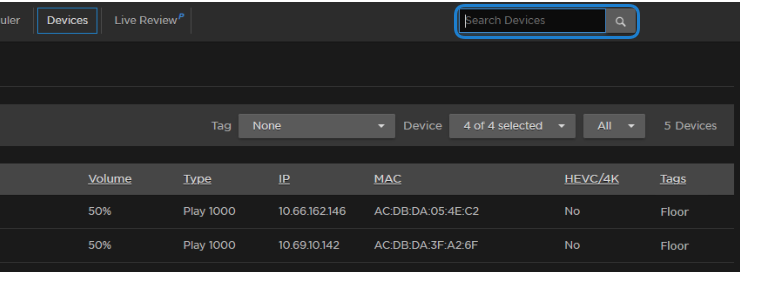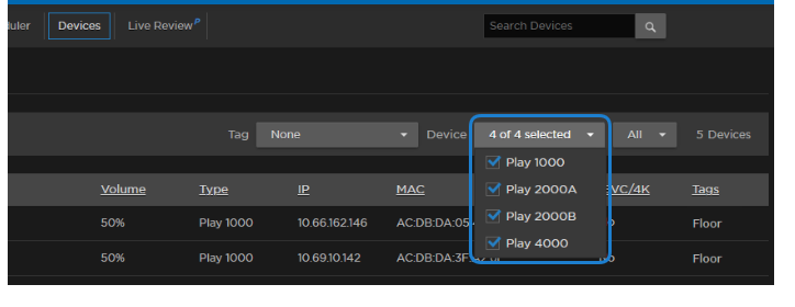 You can also filter the displayed list by tags (if defined on your system). Simply click in the Tag dropdown and select the tag to filter by. This is useful to narrow down and manage a long list of devices. To add or delete tags, see Editing Device Settings.