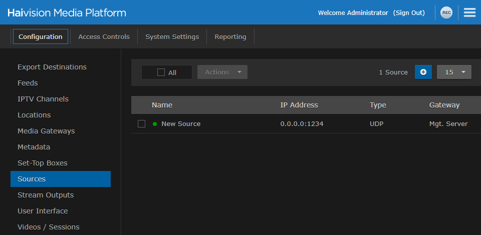 A source is an incoming unicast or multicast video stream or IPTV channel that can be recorded or viewed live. Haivision Media Platform provides access to video streams originating from Haivision Makito and Makito X encoders or other systems that produce compatible MPEG-TS video streams. When setting up HMP, you need to specify the streaming A/V sources to be available for content creators and others to view and capture.