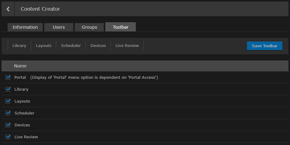 If a role does not have permission for a particular toolbar item, that takes precendence over the toolbar customization here. For example, if the role does not have the STB Administration permission and the toolbar customization setting for Devices is enabled, the Devices item does not appear in the navigation toolbar.