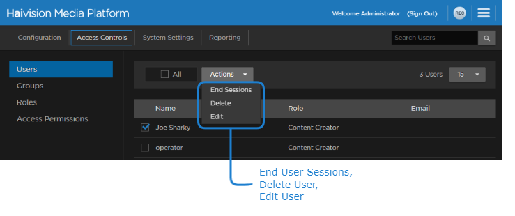 Haivision Media Platform allows you to display a list of users, add/delete them, change their passwords, assign roles to them, and end any of their current sessions. The available functionality of the Users list depends on the account usecase defined in the User Provisioning/SSO screen, as described in Managing User Provisioning/SSO.