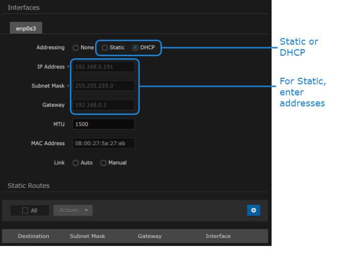 On the Network Configuration page, for the first network interface (enp0s3 in the following example), either: