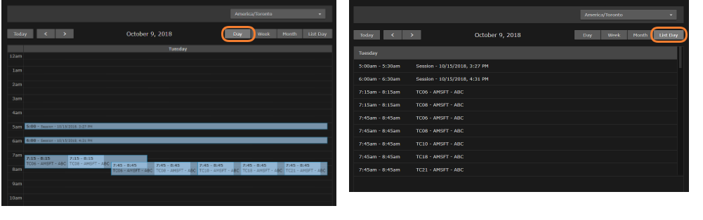 You can switch the view by clicking the Day, Week, Month, or List Day tabs along the top of the calendar.