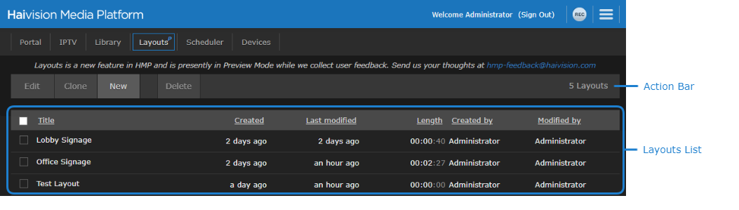To view existing layouts, click Layouts in the navigation bar. The Layouts screen opens, which displays summary information for each layout, including the title, creation and last-modified dates, length, owner, and user who last modified.