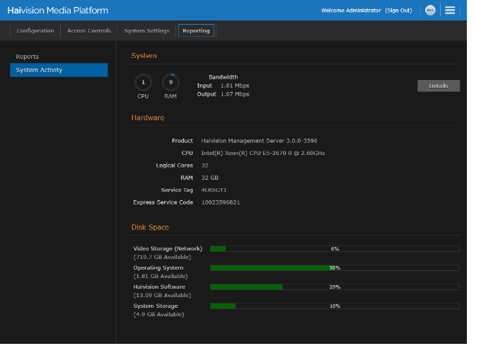 The available space for (local) video storage, operating system, Haivision software, and system storage (in GBs available, as well as percent used).
