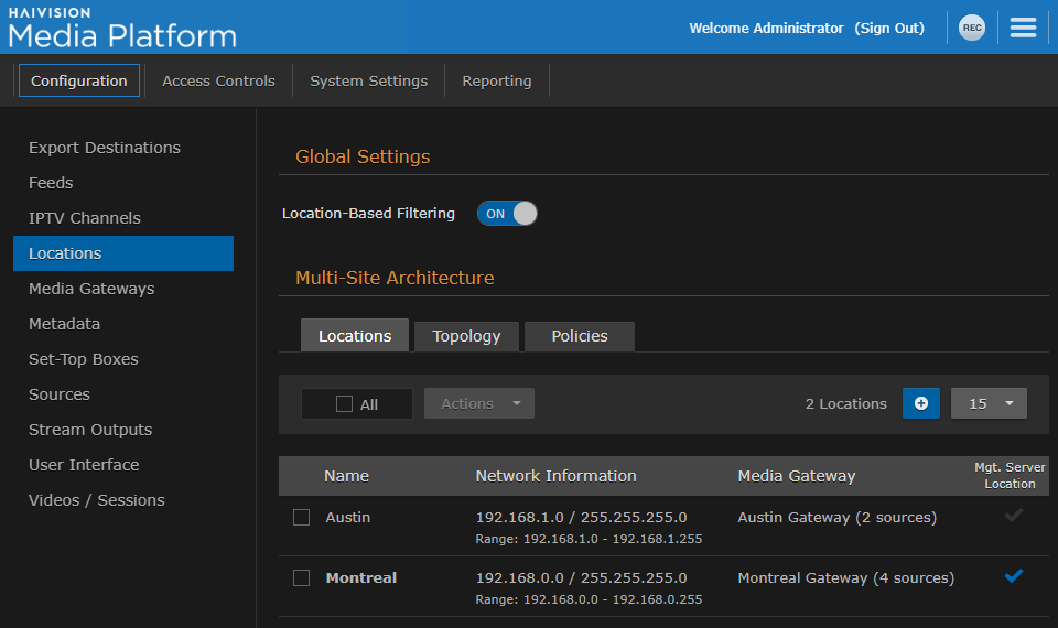 Location-based filtering restricts visibility of sources in Portal and IPTV views for all clients (browser and Haivision Play STBs) based on viewer location for all non-administrator roles. For example, if a source is sent to a Media Gateway at the Montreal location and a user is in the Austin location, the source does not appear in the Portal or IPTV section of the HMP browser. (The Library view is not affected.) If the user then travels to the Montreal location and signs in to HMP, the source appears for the user to view.
