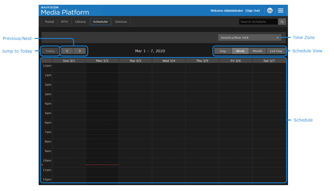 To change how the schedule appears, click the Day, Week, Month, or List Day buttons.