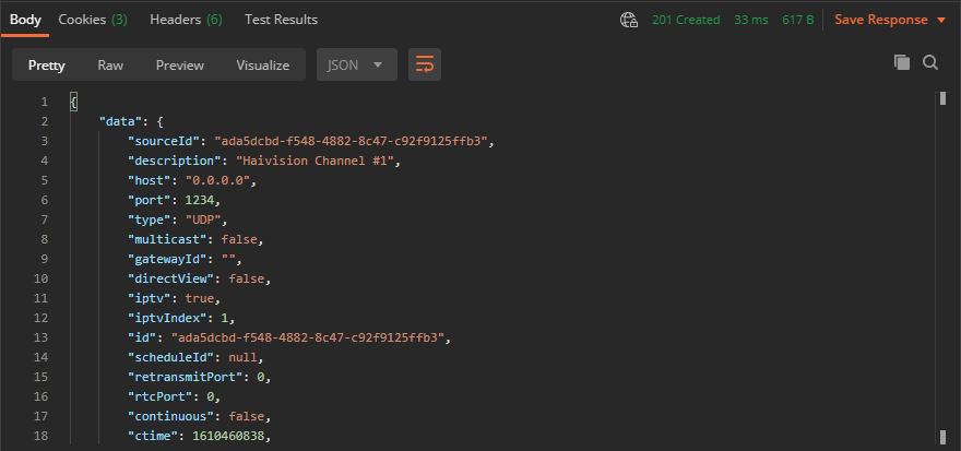 3. Click the Body tab and enter the source id that was noted in Step #3 in the Get List of Sources procedure using the format defined in Add a Session Source.