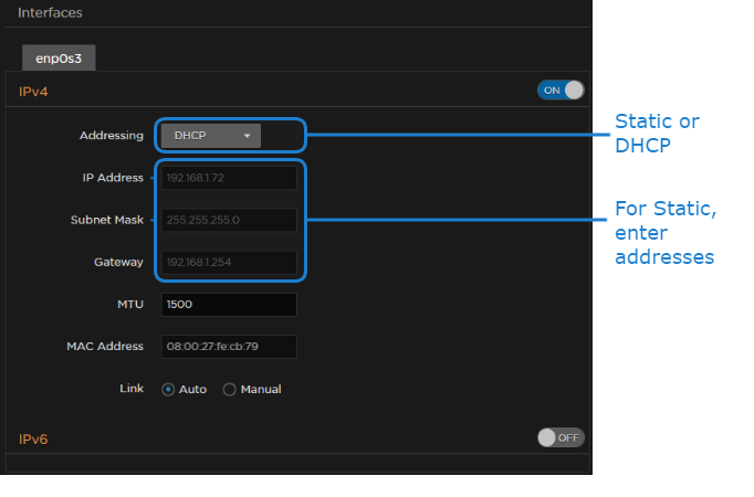 On the Network Configuration page, for the first network interface (enp0s3 in the following example), either: