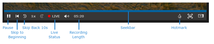 Clicking within the seekbar moves the player position to where you clicked. The toolbar changes to show the other features as shown in the Recording - Not Live tab. If any hotmarks are present, they are shown at their locations within the seekbar.