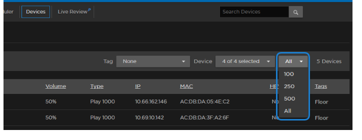 You can also filter the displayed list by tags (if defined on your system). Simply click in the Tag dropdown and select the tag to filter by. This is useful to narrow down and manage a long list of devices. To add or delete tags, see Editing Device Settings.