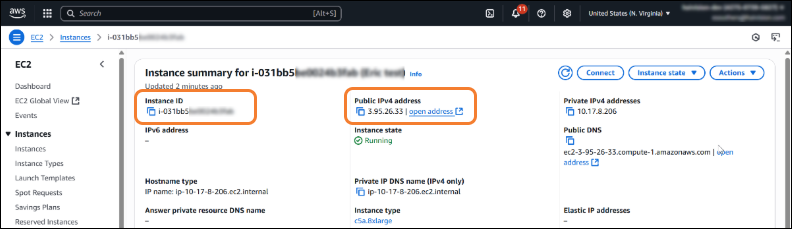 Take note of the Public IP address and Instance ID assigned by AWS to your instance. The Instance ID is the default password for signing into web interface.