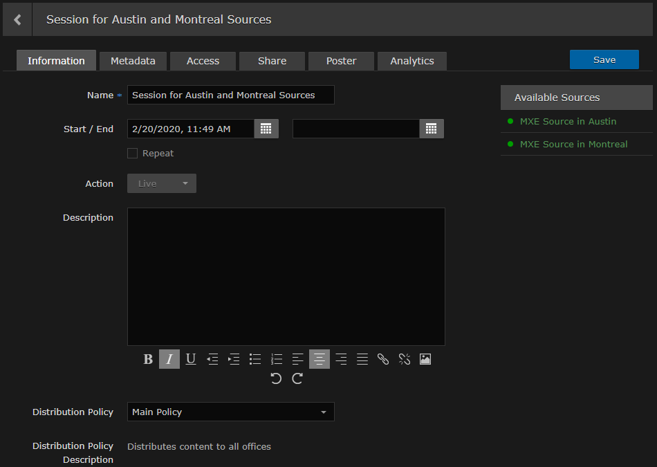 1. On HMP, create sessions for the configured sources and assign the appropriate distribution policy for each. See Adding a Session in the User's Guide for details. For this example, both sources are added to a single session, the distribution policy sends the content to both locations, and the session starts immediately.