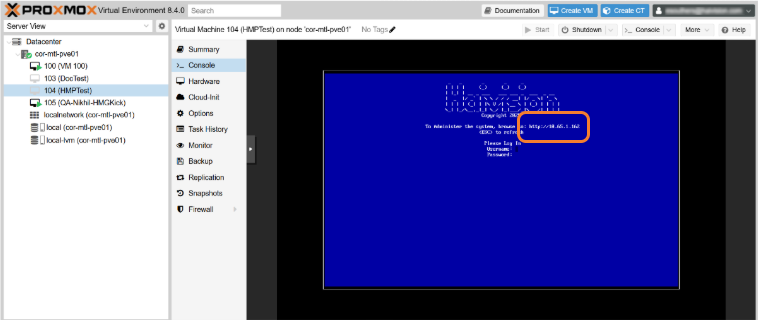 After a few minutes the Console UI appears. Make note of the IP address assigned to your VM: