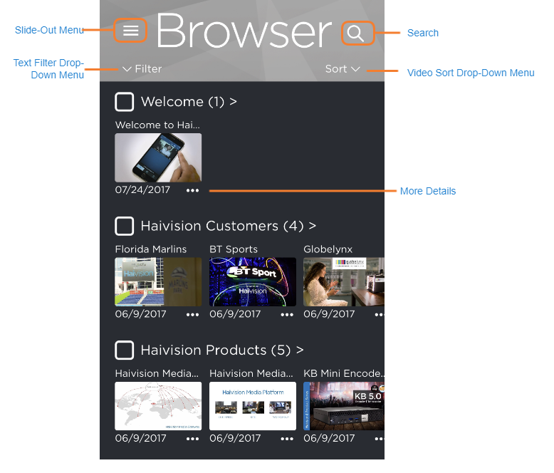 After signing in to Play Pro, select Go to the Browser. When connected to an available service, the Browser displays the selected HMP (by default, this is the Haivision Demo Server).
