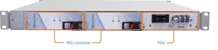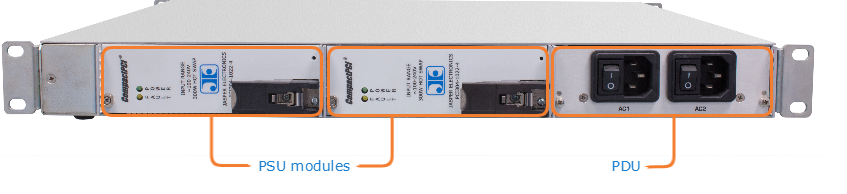 The F-MB6X-RAC and F-MB6X-DC chassis have removable power supplies (PSUs) and power distribution unit (PDU) (as shown in the figures below).The F-MB6X-RAC and F-MB6X-DC chassis are fully redundant and can run using one or both PSUs. If using both, they share the load 50-50. One PSU can power all six cards in the chassis.