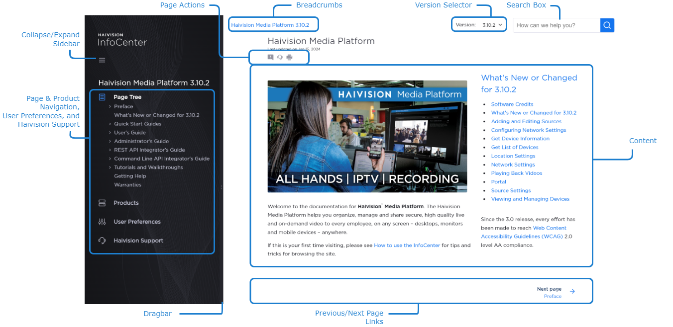 button collapses or expands the sidebar. Useful for smaller screens or wide content pages.Page tree – The page tree provides links to navigate the content relative to the current product and version you are currently browsing. You can expand or collapse parent headings as necessary.