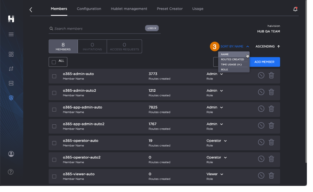 Use the Sort By drop-down to sort members by name, routes created, time usage, or role.
