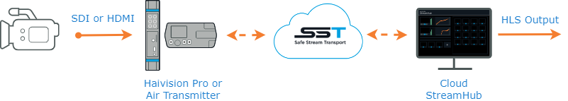 This detailed procedure guides you through the complete setup of a video transmission between a mobile transmitter and a Cloud StreamHub, as illustrated in the following figure.