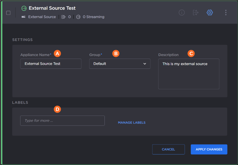 | Labels | Allows you to attach labels to your appliance for easier filtering of the appliance list. See Managing Appliance Labels for details on creating and editing labels and applying labels to an appliance. |