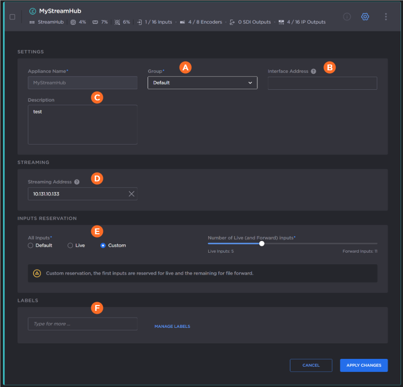 | Streaming Address | Specifies a custom address or domain name for video streams instead of the existing appliance address. This address or domain will be used by Hub 360 to create video routes and transmissions to this StreamHub. This allows you to: