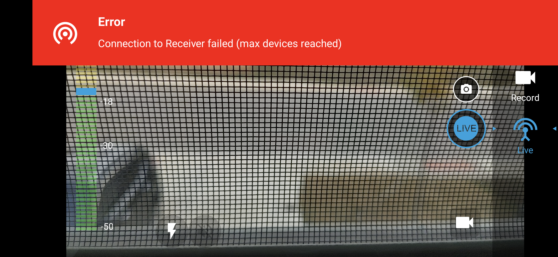 If you try to start a MoJoPro Live or File Forward when no license is available, a connection error appears on both Hub 360 and the MoJoPro app: