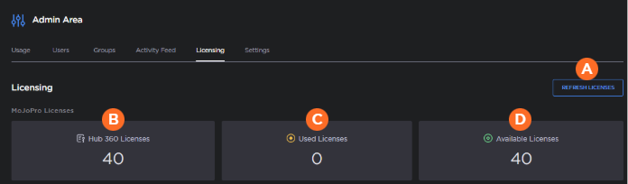 The Admin Area's Licensing tab allows admins to view their Hub 360 subscription information and to track and manage usage of your MoJoPro licenses.