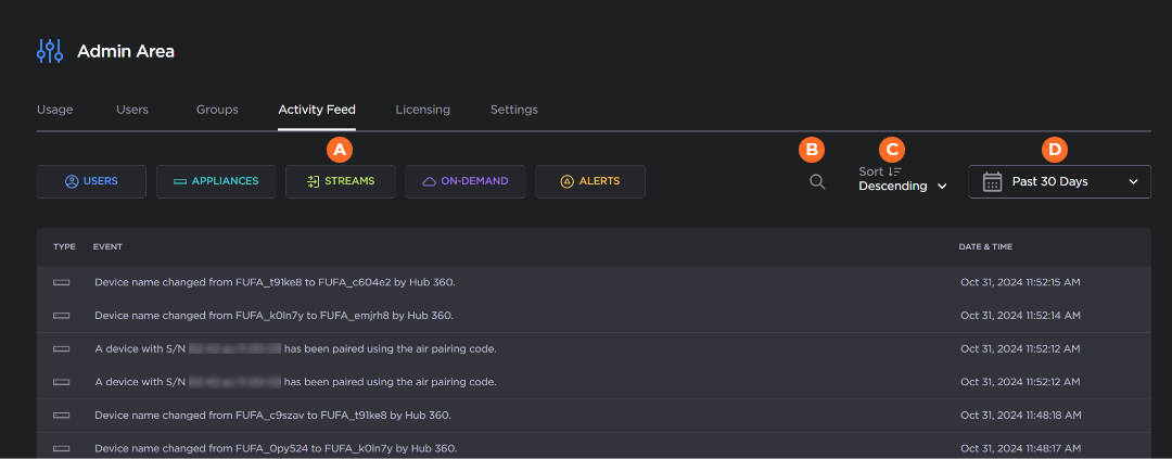 button opens a text box to search the activity feed for various information (device name, group name, and pairing code name).