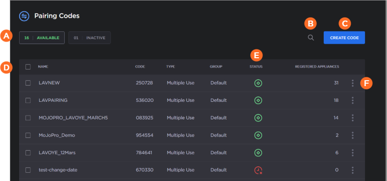 | The pairing codes status buttons (available or inactive) can be used to filter the pairing codes list. |
