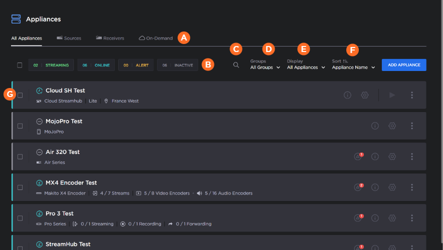 The Appliances screen allows you to manage and control your connected Haivision devices (encoders, decoders, transmitters, and receivers).