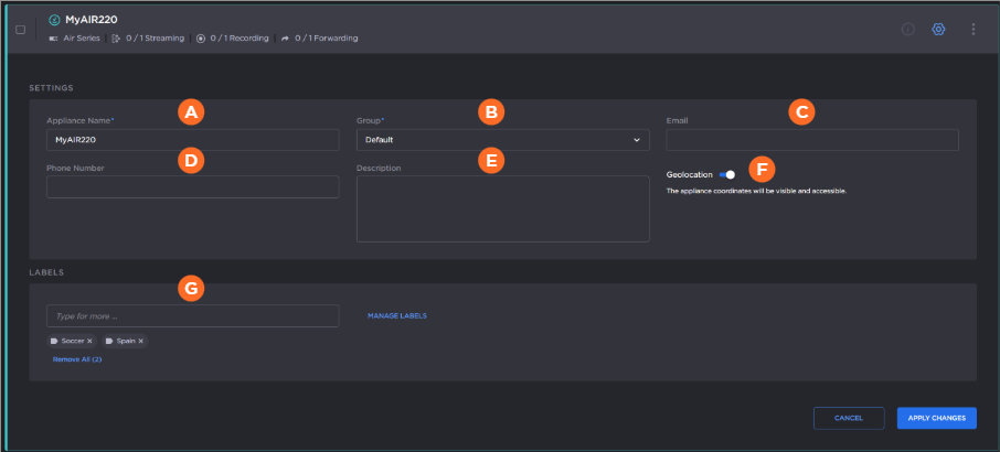 | Labels | Allows you to attach labels to your appliance for easier filtering of the appliance list. See Managing Appliance Labels for details on creating and editing labels and applying labels to an appliance. |