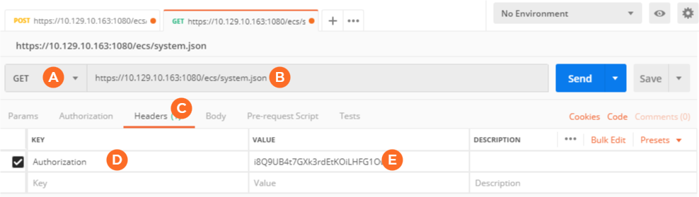 https://<KB URL>:1080/ecs/system.jsonSince all requests require the Session ID in the API command header, click the Headers tab.
