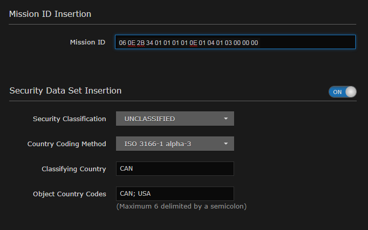 - Configure a mission ID string of up to 127 characters: When the mission ID is configured, any received UAS KLV dataset will be processed in order to modify the existing mission ID or add a mission ID element if not there with the configured value.