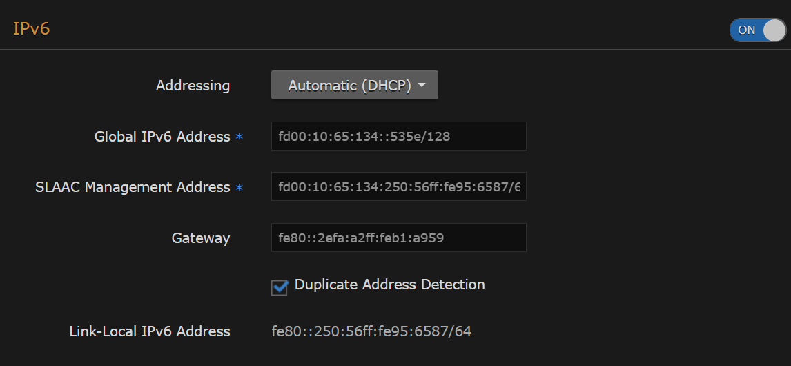 To configure IPv6 addressing, toggle IPv6 to On, and select the appropriate Addressing option. Enter the new value(s) as required. For details see 'IPv6' in Network Settings.
