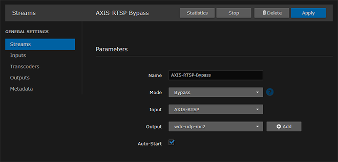 Select an Input, Transcoder, one or more Outputs, and (optionally) one or more Metadata sources to define the stream. See Stream Settings.
