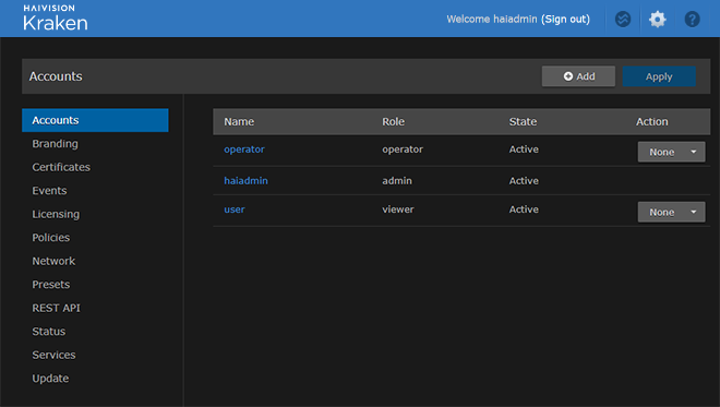 Administration icon on the toolbar and then select the option from the sidebar, for example Accounts, Network, or Presets.