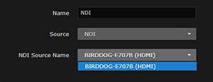 NDI Source Name | (Source must be NDI) Select the NDI source name from the drop-down list of NDI devices (discovered on the network). |