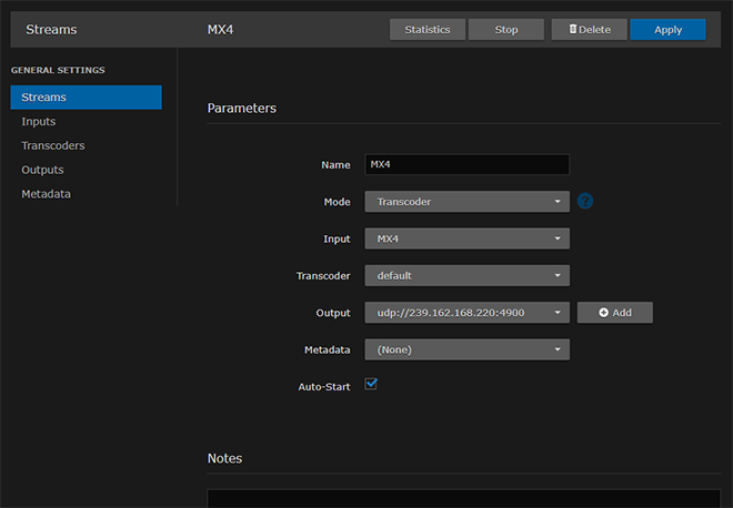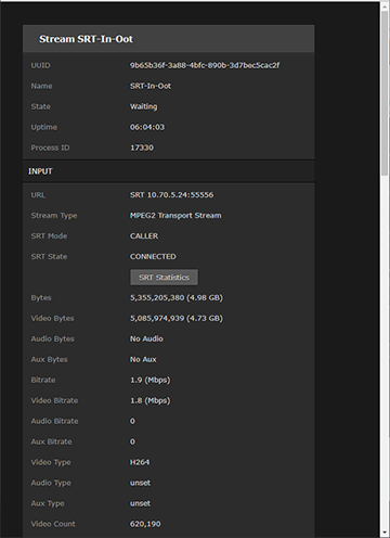 From the Streams Statistics page, you can view statistics for the Stream as well as the configured Input, Decoder, Encoder, and Output. In addition, for SRT streams, the Statistics page includes links to SRT Input and Output Statistics graphs.
