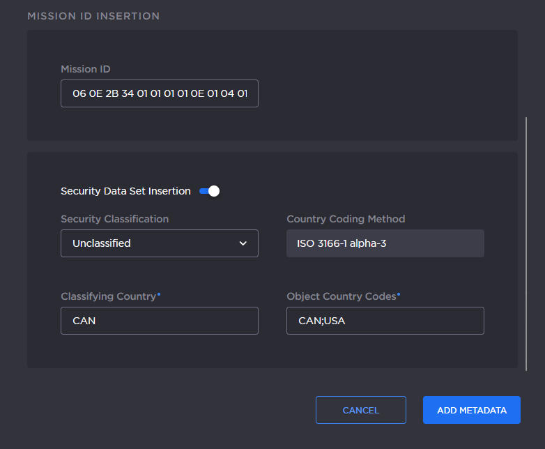 From the Metadata Detail View, you can define a small set of static KLV objects (i.e., mission IDs and security classification) for KLV and CoT metadata sources. This allows customers to modify erroneous or insert missing metadata within outbound TS steams. These options are available: