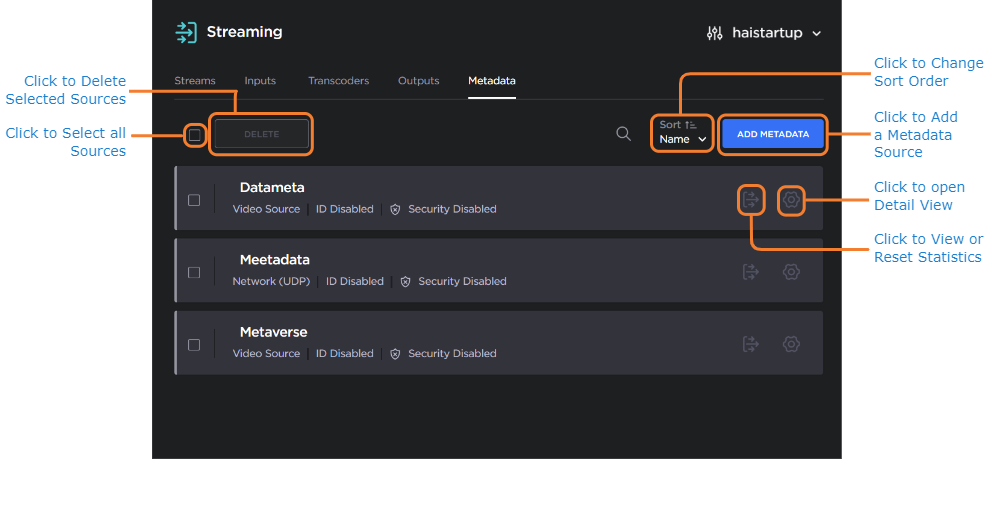Select Streaming from the sidebar, and go to the Metadata tab. The Metadata List View opens, as shown in the following example: