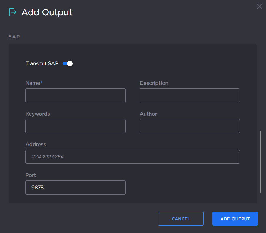 To enable SAP transmission, toggle Transmit SAP on, and fill in the following parameters: