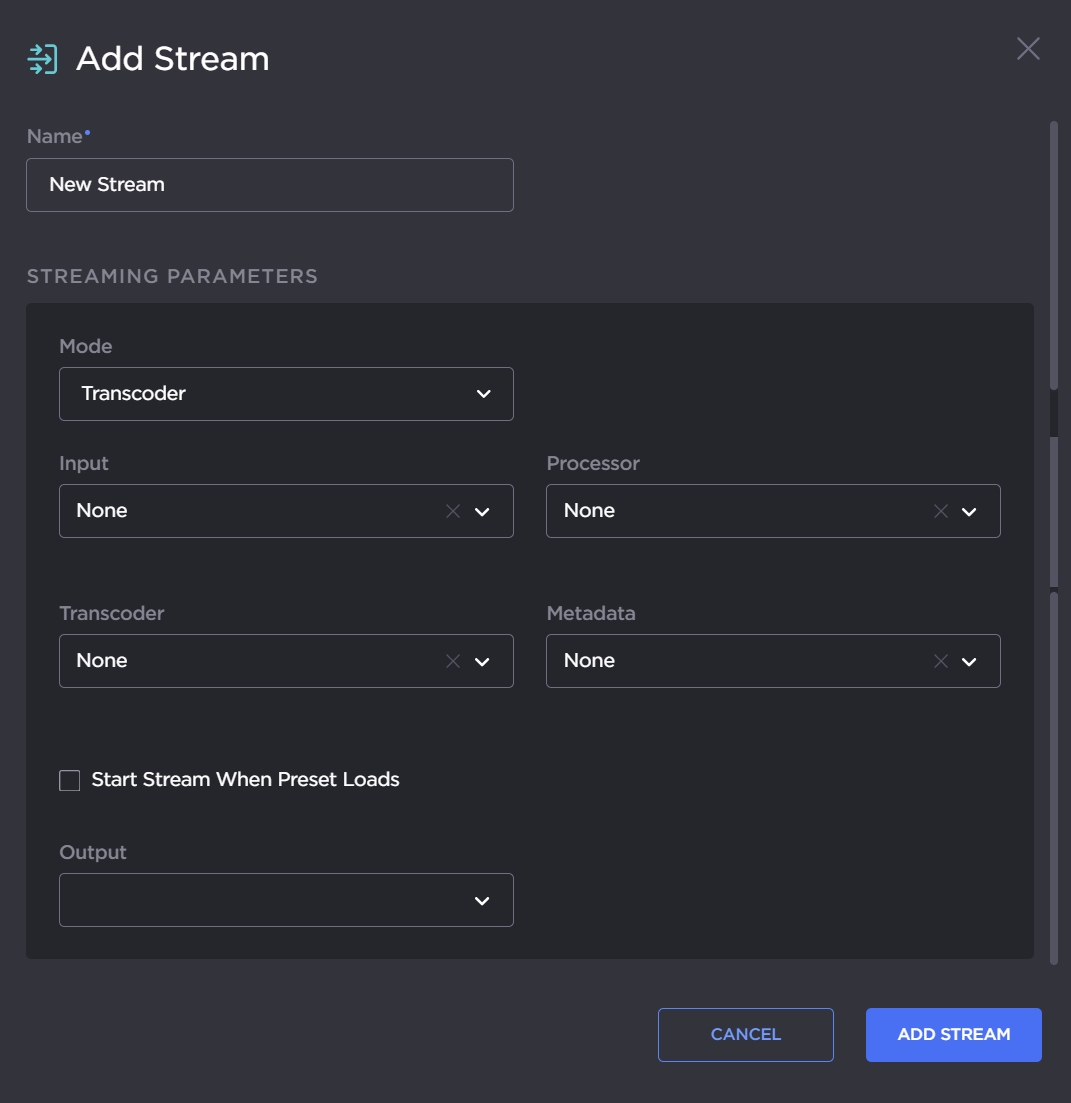 Select an Input, Transcoder, one or more Outputs, and (optionally) one or more Metadata sources to define the stream. See Stream Parameters.