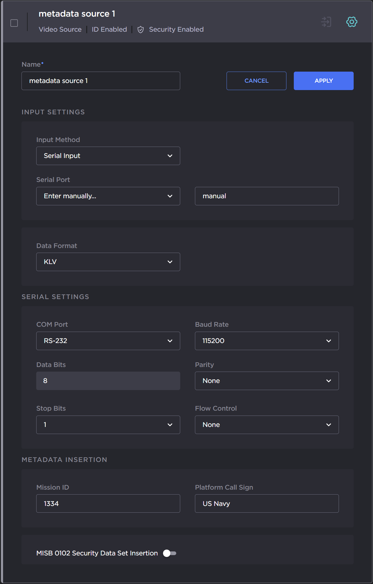 on any metadata source. On the Metadata Detail View, type in the source Name and select the Input Method, either Serial, HD-SDI (Video Source), or Network (UDP).