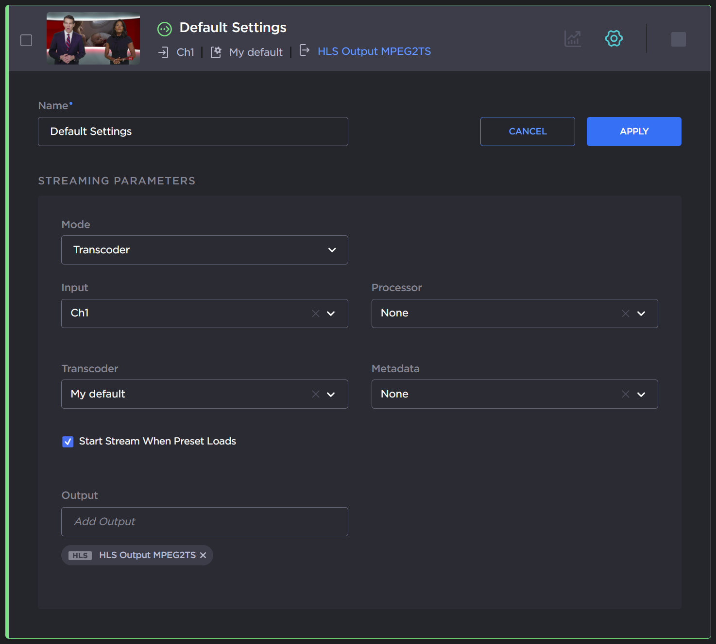 After modifying the streaming parameters, click Apply.