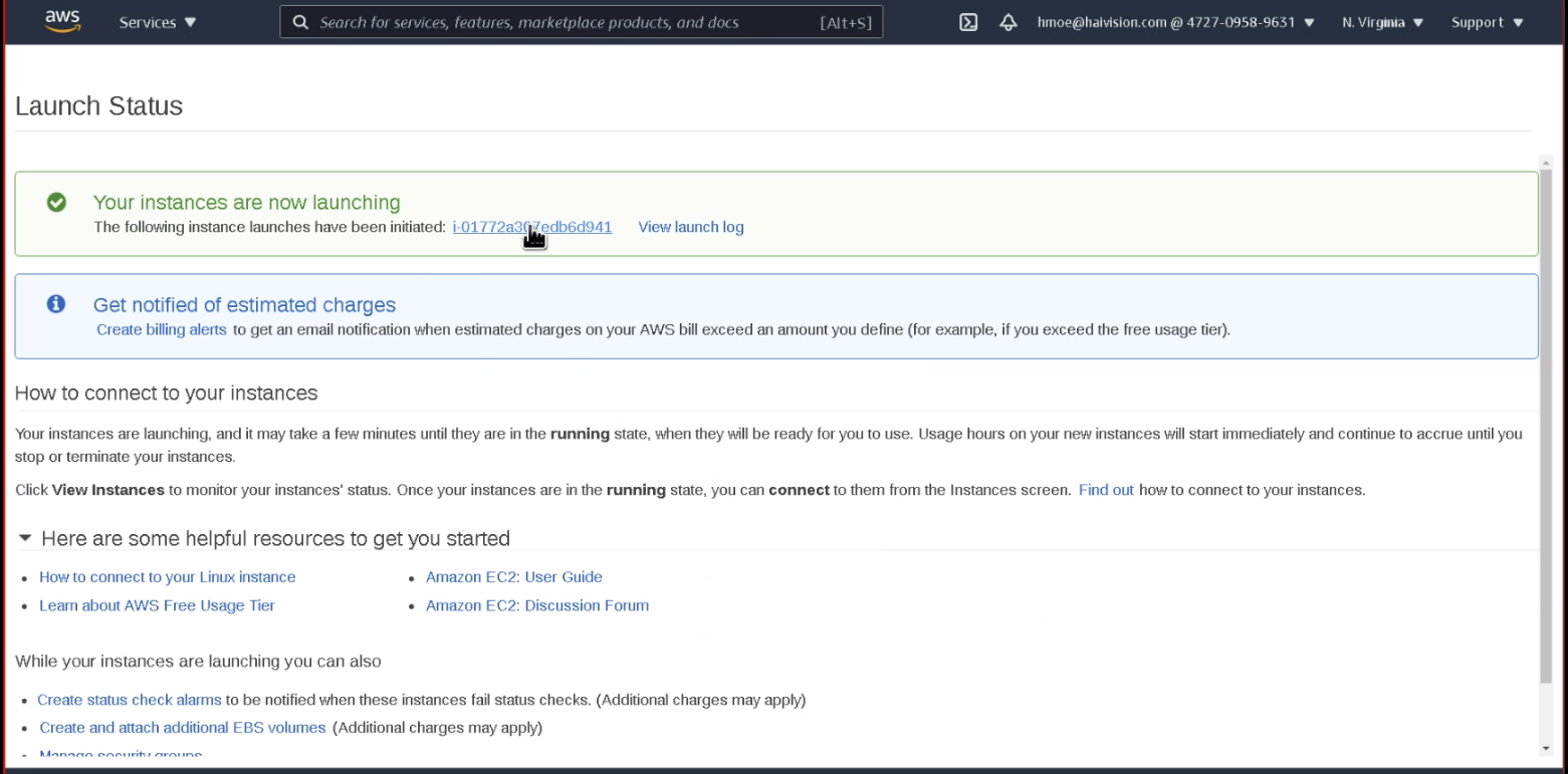 In a few moments, a Launch Status page appears, informing you that your instance is in the process of launching. Creating your server instance can take up to several minutes. At any time, click View Instances to see more details: