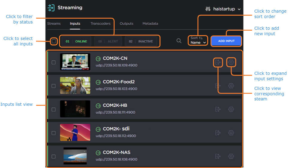 To filter the inputs list view by status, click either Streaming, Alert, or Inactive, in the status filter bar.