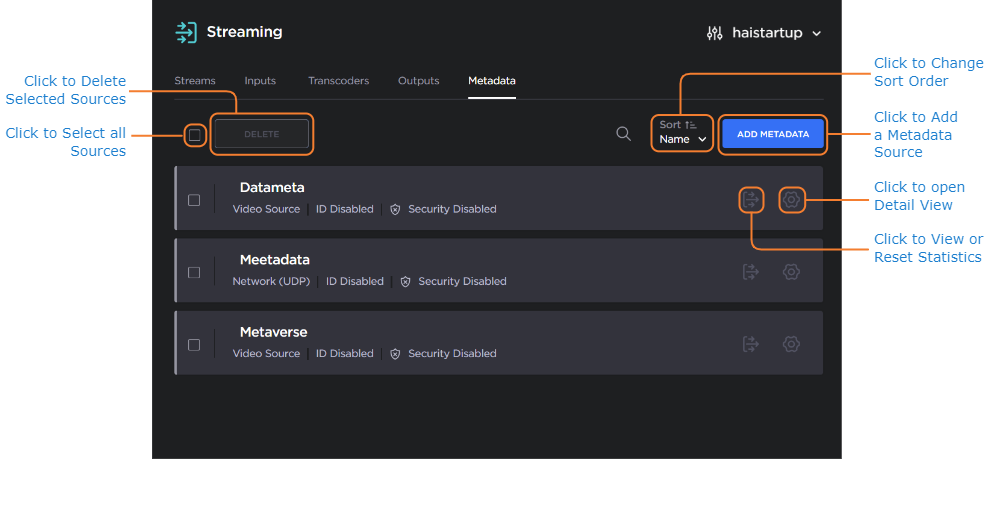 Select Streaming from the sidebar, and go to the Metadata tab. The Metadata List View opens, as shown in the following example: