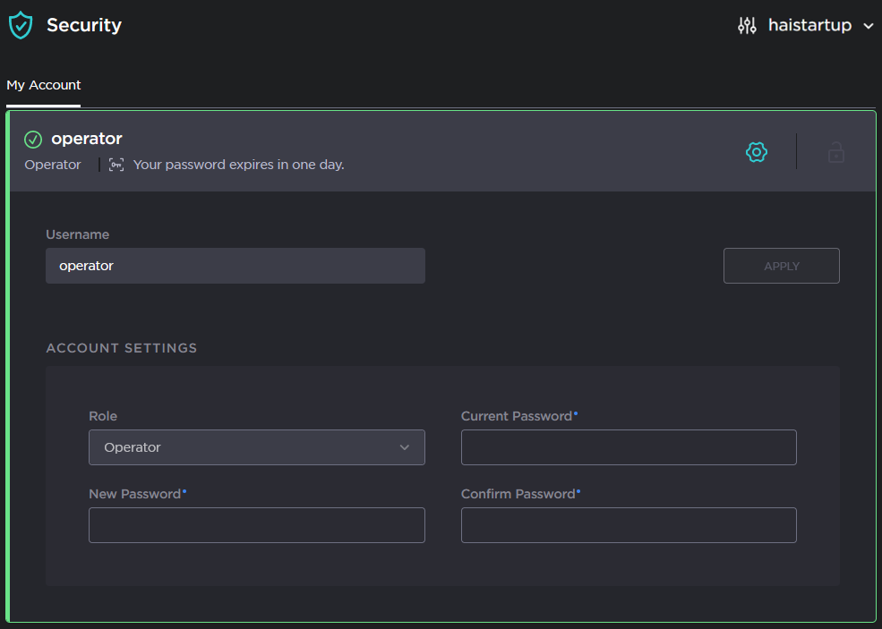 Click Apply. The new password will take effect immediately.