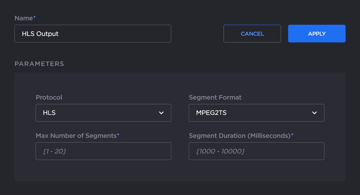 To configure HLS output, select HLS from the Protocol dropdown, then, select the Segment Format (default MPEG2TS), and fill in the Max Number of Segments and Segment Duration.